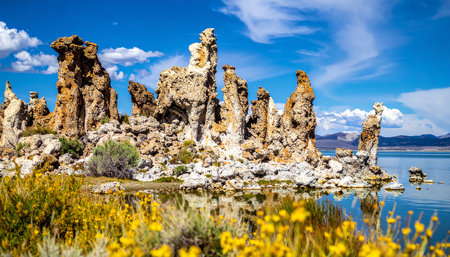 A cluster of tufa towers at Mono Lake is framed by vibrant yellow wildflowers in the foreground, with reflections in the water.