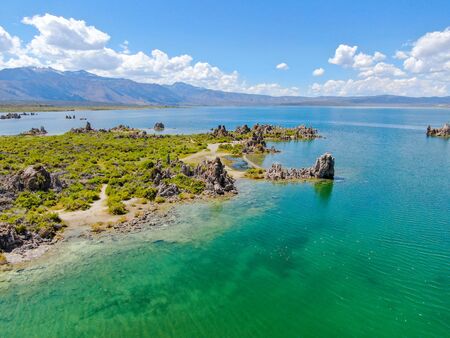 Aerial view of Mono Lake with tufa rock formations during summer season, Mono County, California, USA