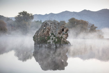 Morning fog on the lake in the mountains. Crimea, Ukraine.