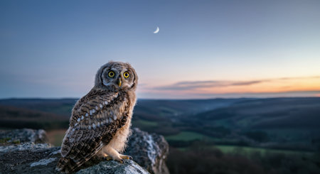 Young owl perched on cliff edge at dusk with crescent moon in background