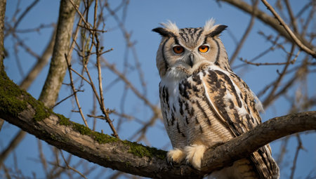 Majestic Owl Perched in the Twilight, Showcasing Beautiful Feathers and Intense Gaze, Symbol of Wisdom and Mystery in Nature's Nighttime Scene