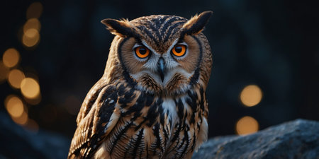 The penetrating gaze of an owl is beautifully juxtaposed with a field of sparkling bokeh lights in the background.