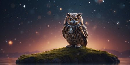 AI Generated. A giant owl with glowing eyes perched on a floating island in space
