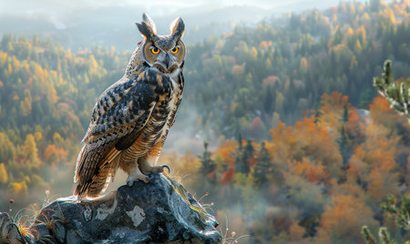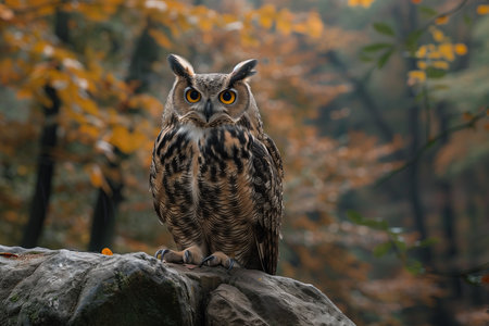Great horned owl sitting on a rock in the autumn forest.