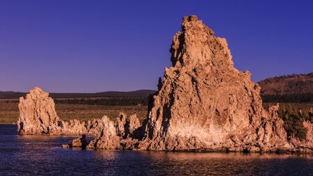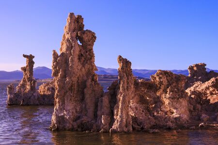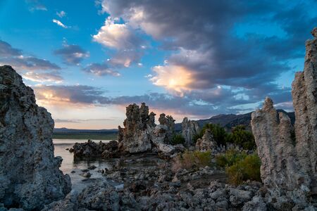 Twilight evening. The columns - remains of Tufa on the bank of the Mono lake. California, USA. The concept of ecological, exotic and photo tourism