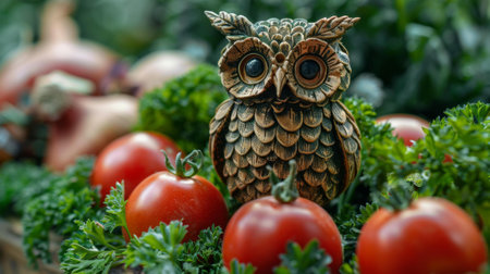 A ceramic owl sits among red tomatoes and green parsley.