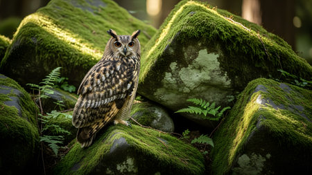 A majestic Eurasian Eagle-Owl perched on moss-covered rocks in a dense forest setting. The bird's intense gaze and camouflage against the green environment highlight its nature as a silent predator.
