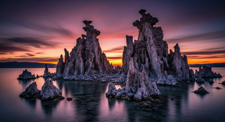 Magically beautiful sunrise. Sunrise at Mono Lake in the crater of an ancient extinct volcano. Shallow lake, a multitude of picturesque reefs Tufa