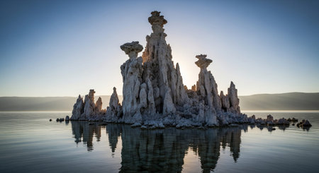 Tufa tower rock formations in Mono Lake are calcium-carbonate spires and knobs formed by interaction of freshwater springs and alkaline lake water.