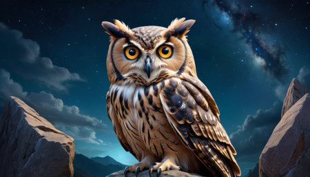 A captivating owl perches stoically on a rocky outcrop, its amber eyes glowing under the celestial tapestry of a clear, star-filled night sky.. AI Generation