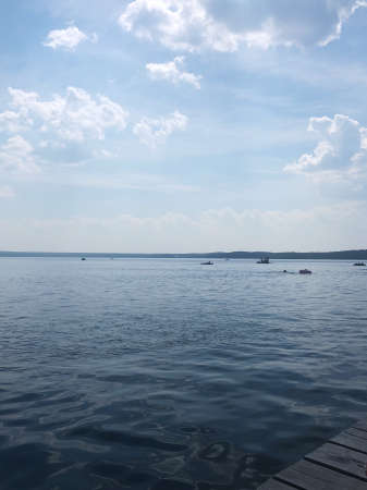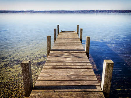 View of lake from wooden pier, Schondorf, Ammersee, Bavaria, Germany