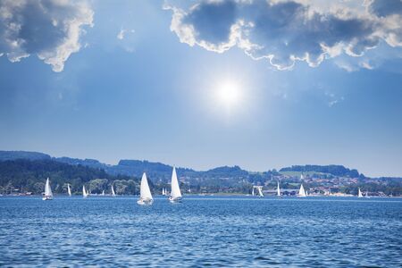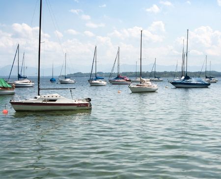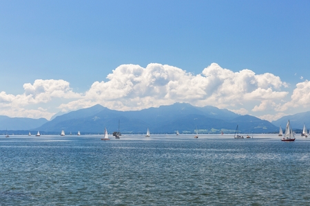 Lake Chiemsee, Bavaria, Germany - August 7th, 2016. Lake Chiemsee with several sailing boats on it and in the backgroung the Bavarian Alps with the well known Kampenwand.