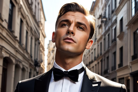 Confident handsome stylish guy in tuxedo and bow tie posing at urban street, serious look. Portrait of fashionable young man businessman in tux outside, lux image James Bond style. Copy ad text space