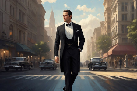 Vintage Romance: Stylish Man in Black Tuxedo on Urban Street. 1930s Retro Style