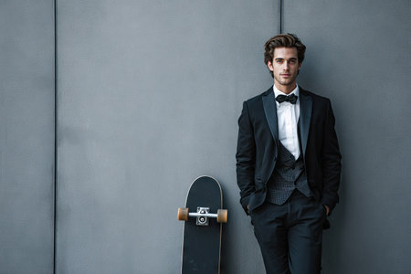 A man in formal attire is depicted leaning against a gray wall, beside a skateboard. The photograph showcases the man's elegant outfit. The lighting is soft and even, highlighting the textures and composition. This image has potential uses in lifestyle, fashion, and editorial content.