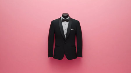 A stylish black tuxedo displayed on a mannequin against vibrant pink backdrop. This elegant formal attire is perfect for weddings, parties, and upscale events.