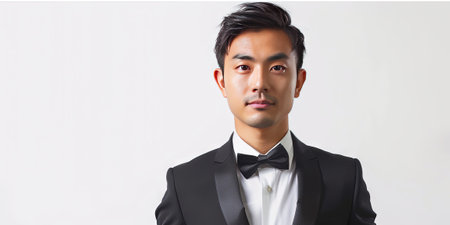Portrait of young handsome Asian man in tuxedo and bow tie