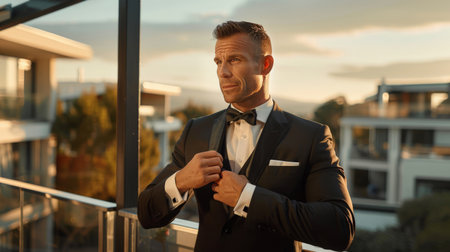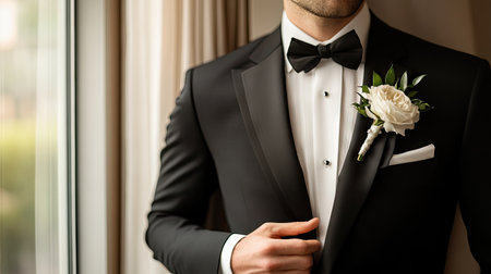 A groom in a stylish setting, standing confidently in formal attire, with warm lighting and a sophisticated atmosphere that highlights his elegant wedding preparation.