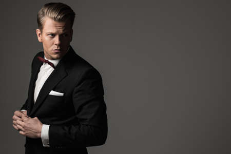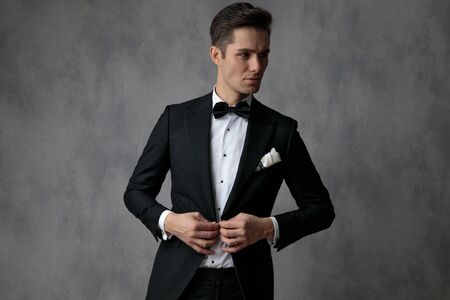 young elegant man wearing tuxedo, looking to side and arranging coat, standing on grey backgorund in studio