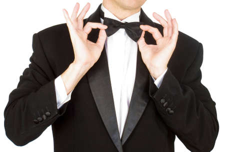 Portrait the man in a classical tuxedo on an white