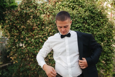 Handsome young elegant man in tuxedo at hotel room