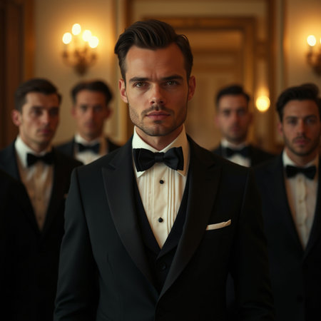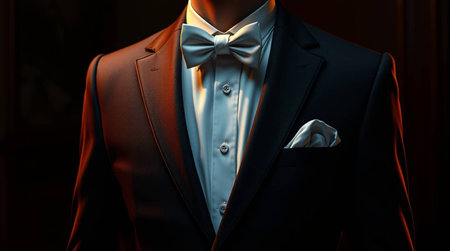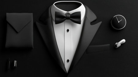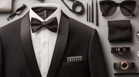 Sleek tuxedo and minimal accessories arranged for modern luxury branding