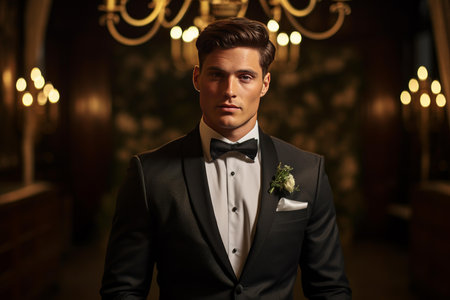 Stylish man in a tuxedo poses confidently in a well-lit indoor setting during a formal event Generative AI