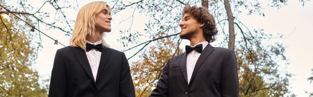 Two young men stand together, radiating joy and connection while dressed in formal suits. Surrounded by trees, they share smiles, creating a warm atmosphere that highlights their relationship.