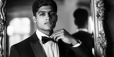 Elegant Young Man in Tuxedo Adjusting Bow Tie in Black and White Reflection.