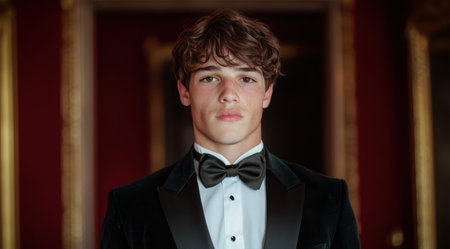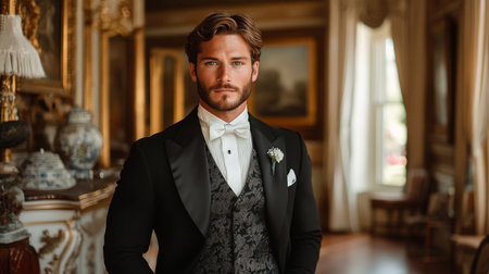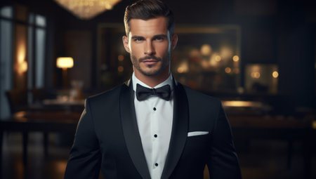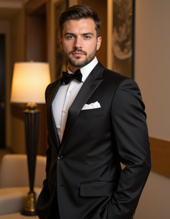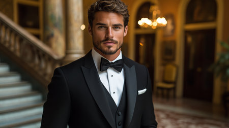 Portrait of a sophisticated man dressed in a formal tuxedo standing in a grand hotel hallway