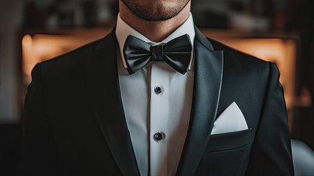A close-up image of a well-dressed man in a tuxedo, featuring a classic bow tie and pocket square. Perfect for themes of elegance, style, and celebration.