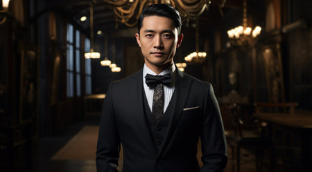 Elegant man in black suit and bow tie in hotel lobby