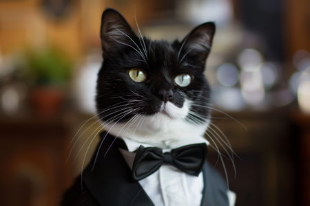 A black and white cat in a tuxedo, epitomizing sophistication and charm with its formal attire, A dapper tuxedo cat posing for a portrait, AI generated