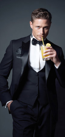 Sophisticated Handsome Young Man in Elegant Black Tuxedo and Bow Tie Drinking Yellow Citrus Cocktail with a Straw, Glamorous Fashion Portrait of a Stylish Gentleman in Formal Evening Suit Garment.