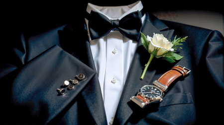 An exquisite tuxedo featuring a bow tie, white rose boutonniere, cufflinks, and a stylish watch is arranged neatly, ready for a wedding ceremony, showcasing timeless elegance and preparation.