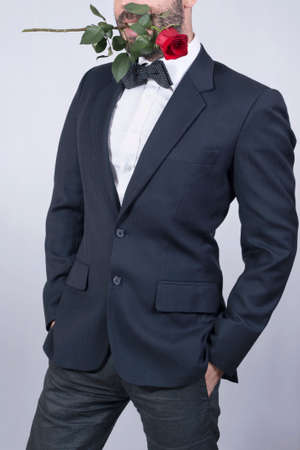 portrait of sexy businessman in tuxedo with bowtie posing with hands in pockets in front of grey background