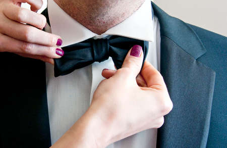 A woman's hand straightens the groom's bow tie