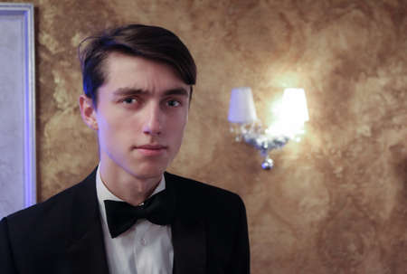 Elegant young guy portrait against light background. Young man in black suit with white shirt and black bow tie.