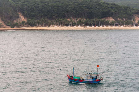 Nha Trang, Vietnam - March 11, 2019: Evening, traditional blue and red small fishing boat sails off port with Vinh Nguyen beach and forested hill in back.