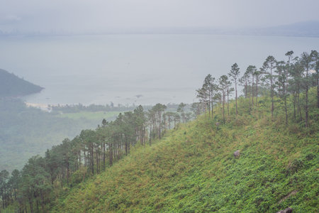 Panoramic view of the sea landscape from the top of the mountain. The blue sea, the hills covered with greenery in the background, the islands visible on the horizon. Beautiful landscape with travel in Asia.