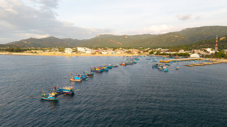Phan Rang town, Ninh Thuan province, Vietnam - November 27, 2016 : the beautiful panoramic landscape of Vietnam beach, Vinh Hy bay, Ninh Thuan, with group of boats are anchoring at fishing village