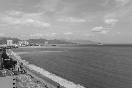 Black and white view of Nha Trang city roads, coastline and mountain landscape
