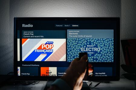 Paris, France - Circa 2019: Apple TV menu on Panasonic Plasma tv living room with top 100 list charts Charting now and Radio station French Pop and Electronic radio hits playlist by Apple Music