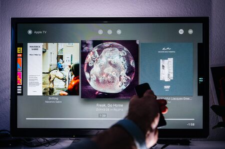 Paris, France - Circa 2019: Man hand holding remote control of Apple TV in front of Panasonic Plasma tv set in living room with music album covers shuffle by Darkside band