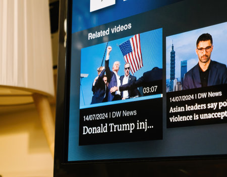 London, UK - Jul 14, 2024: Living room TV with German channel broadcasts live breaking images of an attempted assassination, showing Trump raising his fist and projecting a characteristic image of defiance