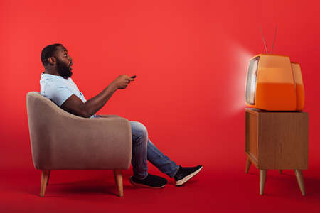 Amazed man in the armchair watches a movie on a vintage tv on red background