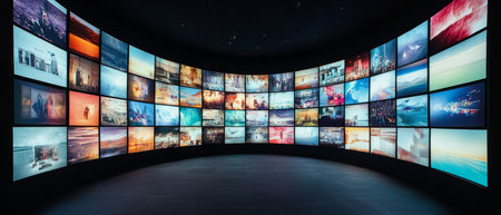 Large wall of illuminated digital screens displaying various images in dark room. Television addiction. Manipulation of people with the help of mass media. Entertainment and streaming content