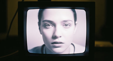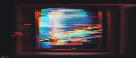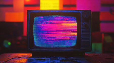 Old television set shows captivating static noise with bright glitch patterns, evoking a sense of nostalgia and digital chaos in a dimly lit room.