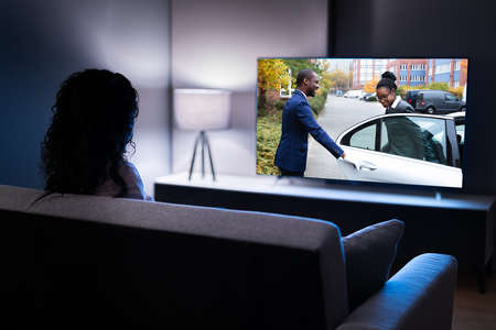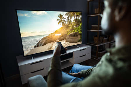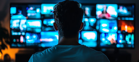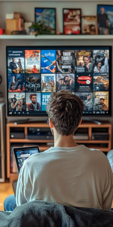 A cozy scene of a male individual seated on a couch, engaged in watching movies on a large television screen, surrounded by modern living room d