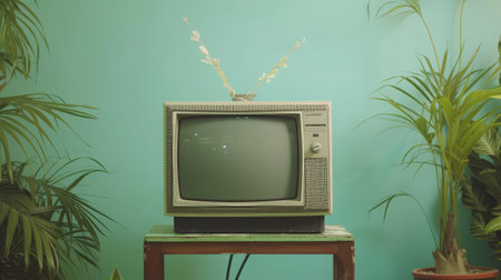 Vintage television set with a static screen in a retro-style room, creating a nostalgic atmosphere. Ideal for themes related to vintage, retro, and classic media.